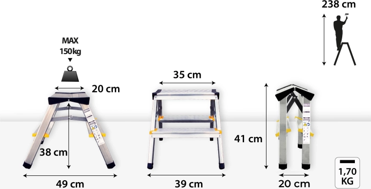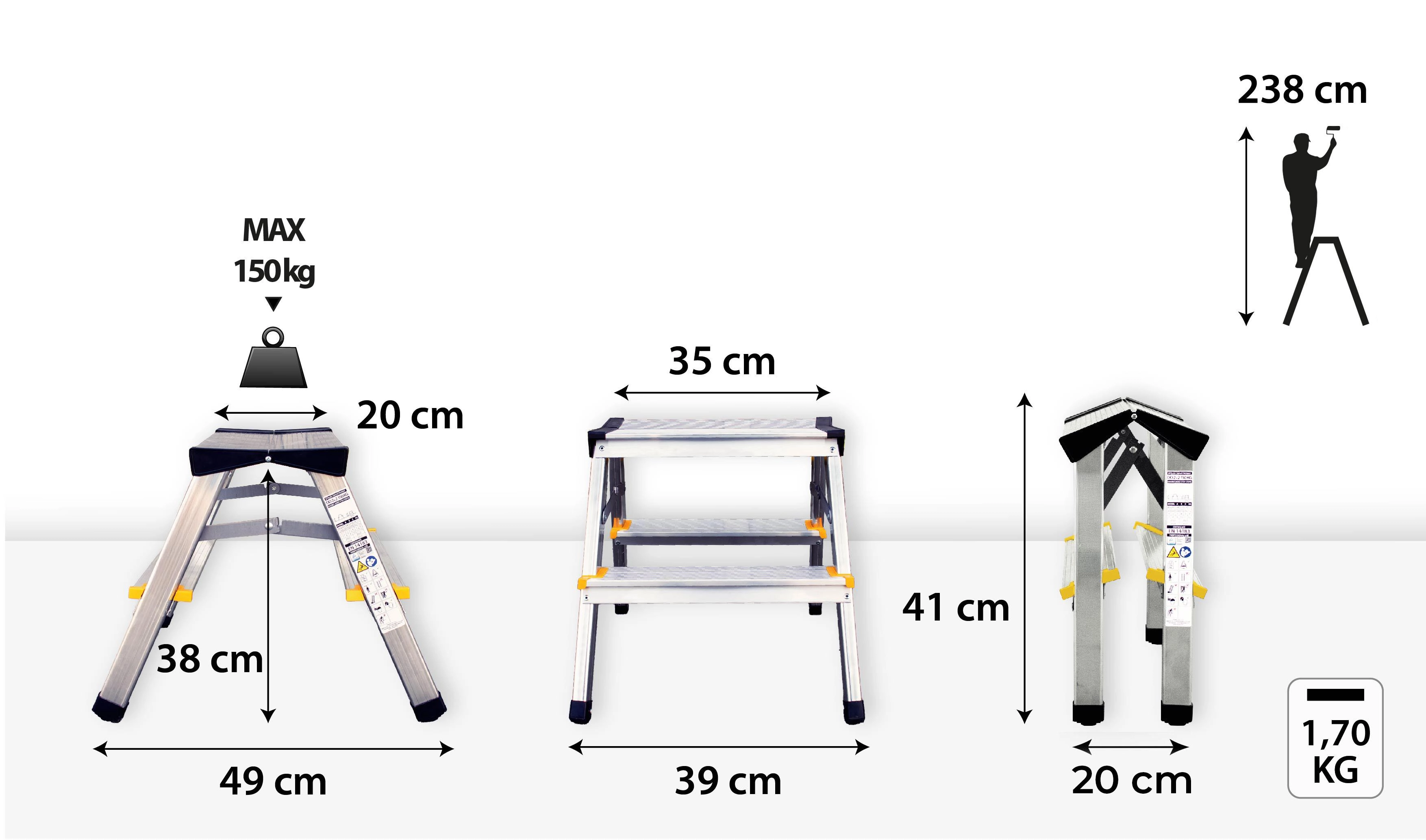 La stabilité est assurée par des renforts supplémentaires, des embouts de pieds antidérapants et une charnière de sécurité qui empêche une ouverture excessive. Le marchepied se plie rapidement en un format compact pour un transport et un stockage aisés. Grâce à la certification TÜV Rheinland et à la conformité EN 14183, il répond aux exigences élevées d’un usage sécurisé.