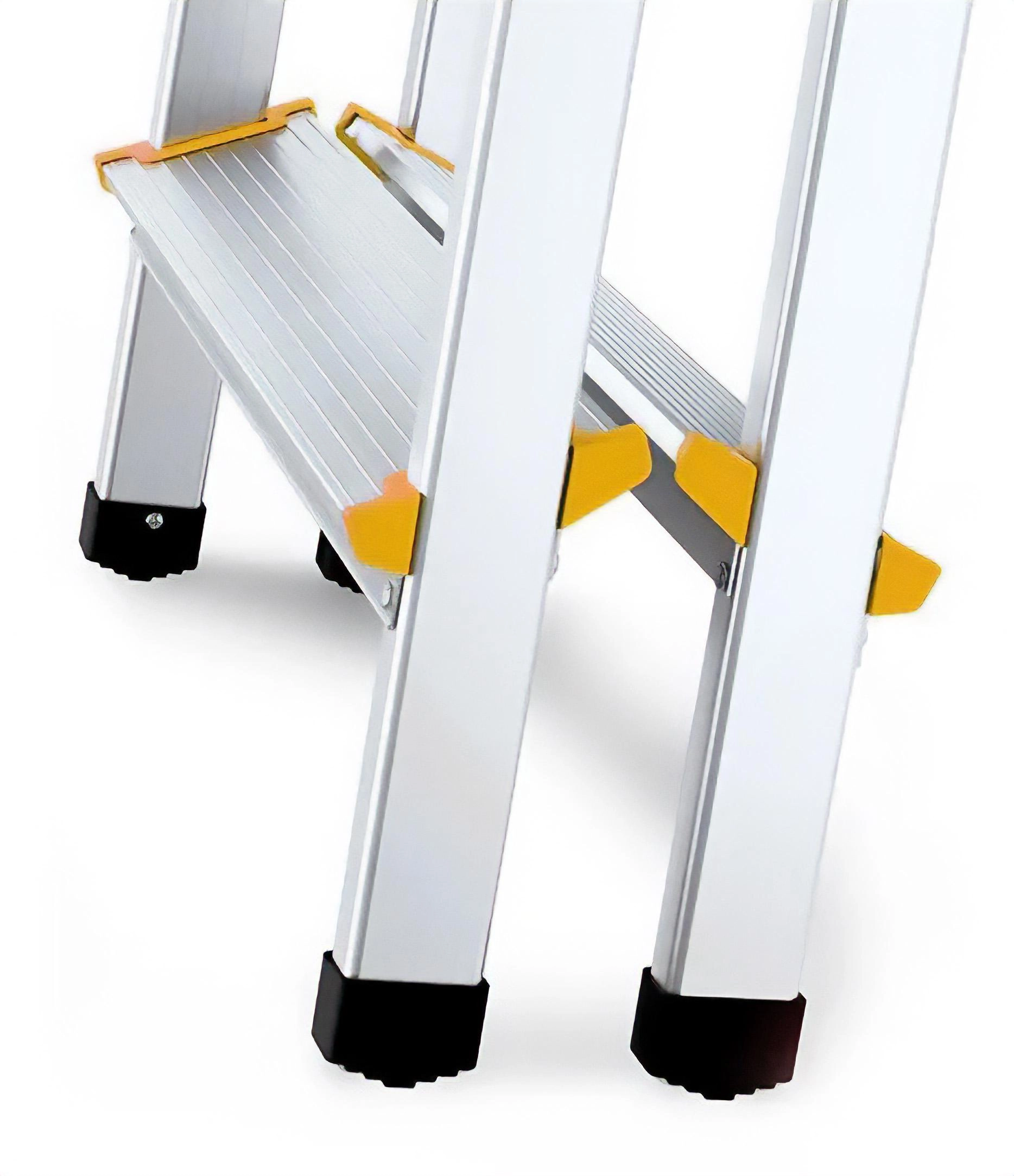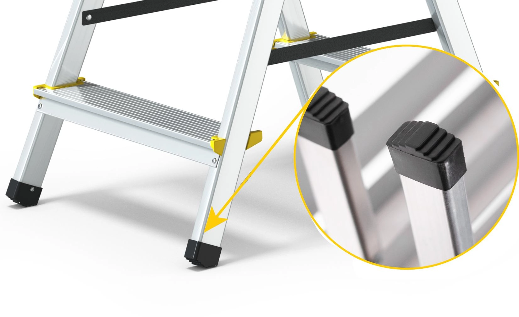 Des marches larges et rainurées avec capuchons de protection ainsi que des embouts de pieds en caoutchouc assurent une station stable et sûre sur tout type de surface.