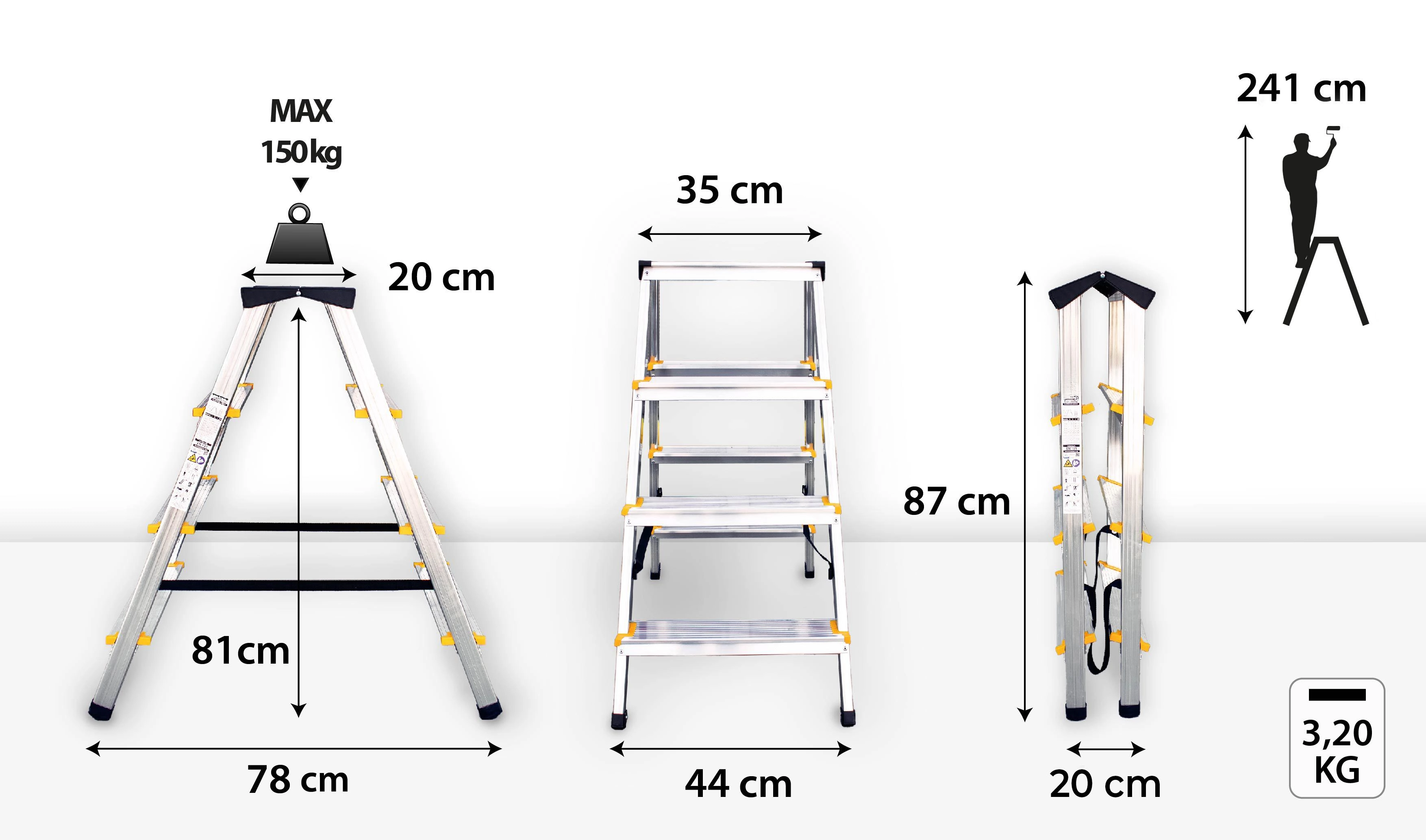 Grâce à sa plateforme de travail confortable et à une charnière pratique empêchant l’ouverture excessive, il est idéal pour la peinture, l’entretien, les montages et les travaux domestiques. Les certifications EN 131 et TÜV Rheinland confirment un haut niveau de sécurité et de qualité.