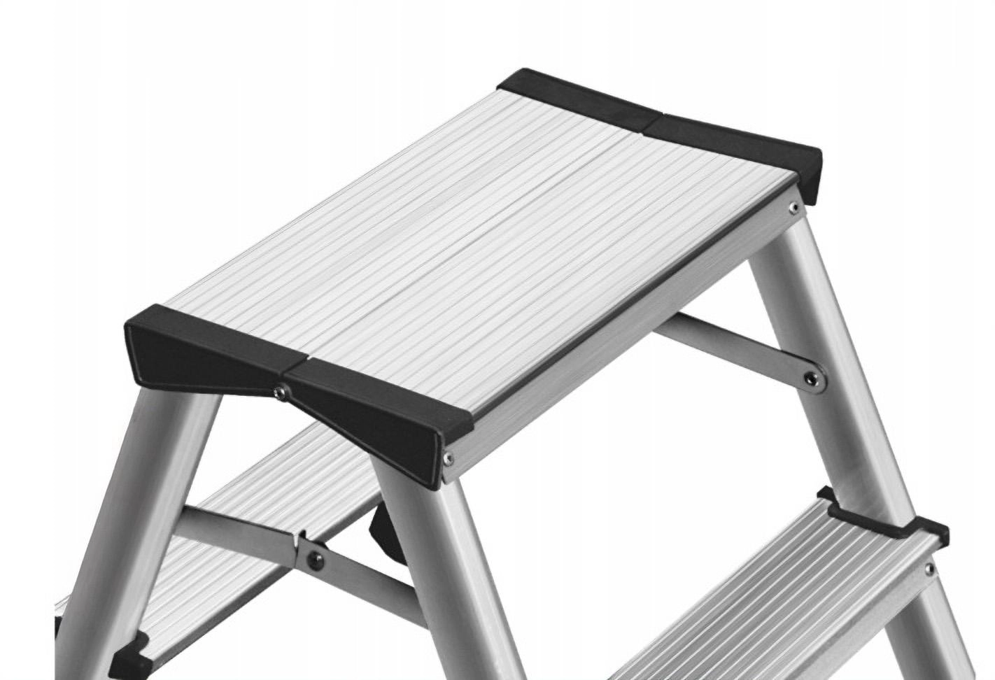 Escabeau professionnel double face 2x4 en aluminium résistant pour un travail en toute sécurité en intérieur comme en extérieur. Il offre des marches larges antidérapantes, une plateforme de travail stable et une capacité de charge de 150 kg. Conforme à la norme EN 131 et doté du certificat de sécurité TÜV Rheinland pour une confiance maximale à l’usage.