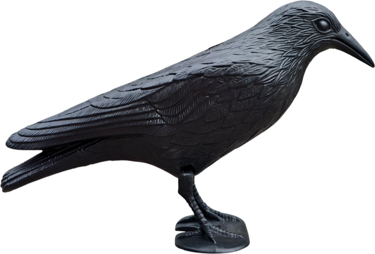 La texture détaillée du plumage et les proportions naturelles imitent un véritable corbeau, renforçant l’effet dissuasif sur les oiseaux indésirables.