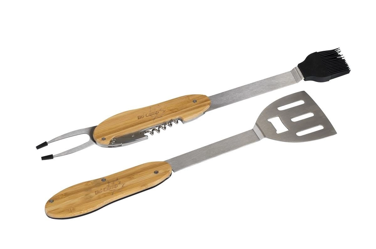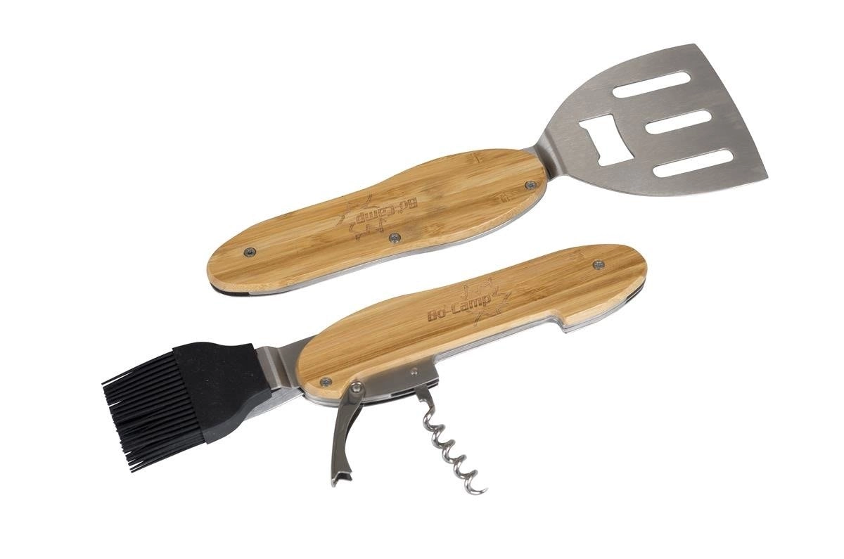 La spatule, la fourchette, le pinceau en silicone, le tire-bouchon et le décapsuleur sont intelligemment intégrés dans un seul set compact. Parfait pour des grillades rapides et bien organisées.