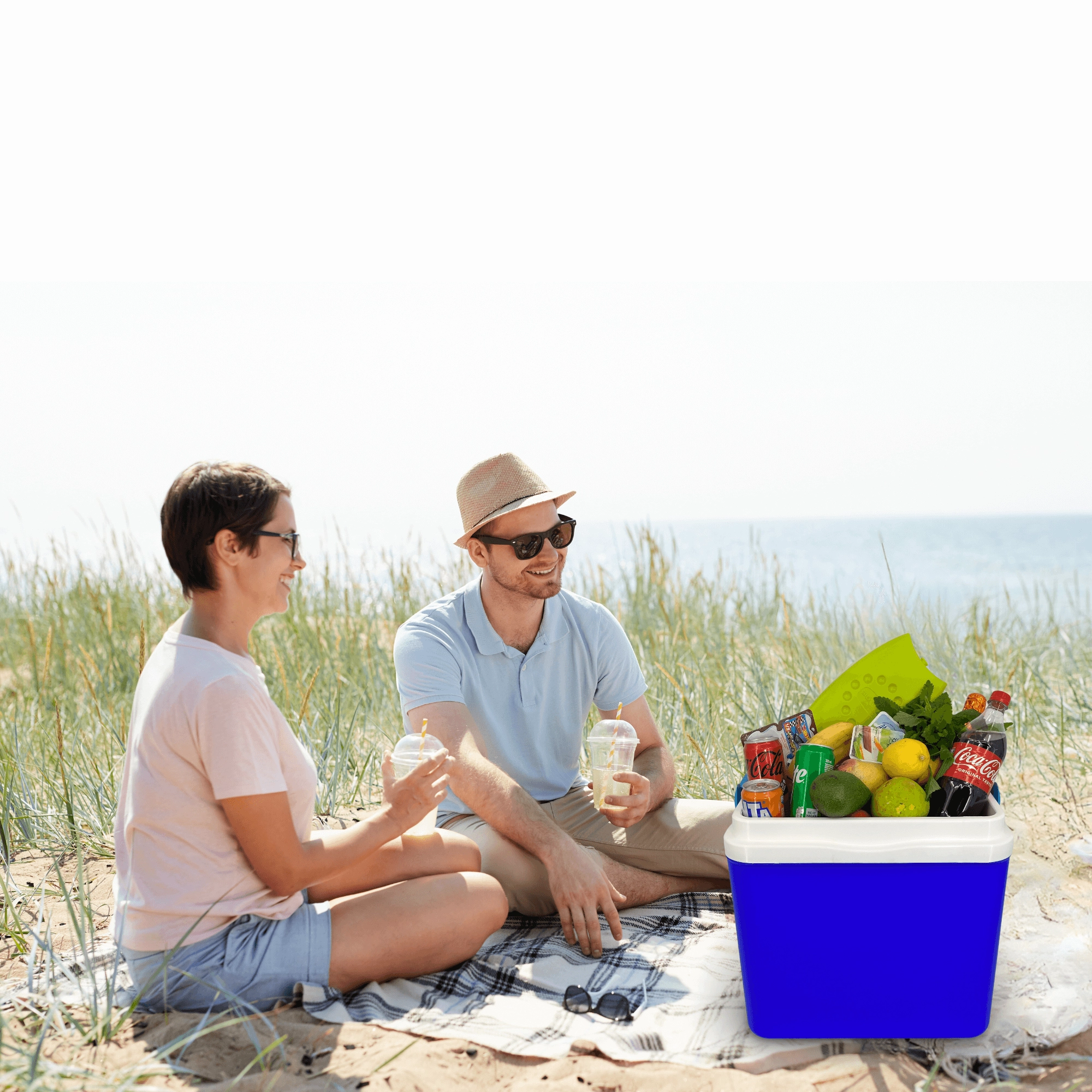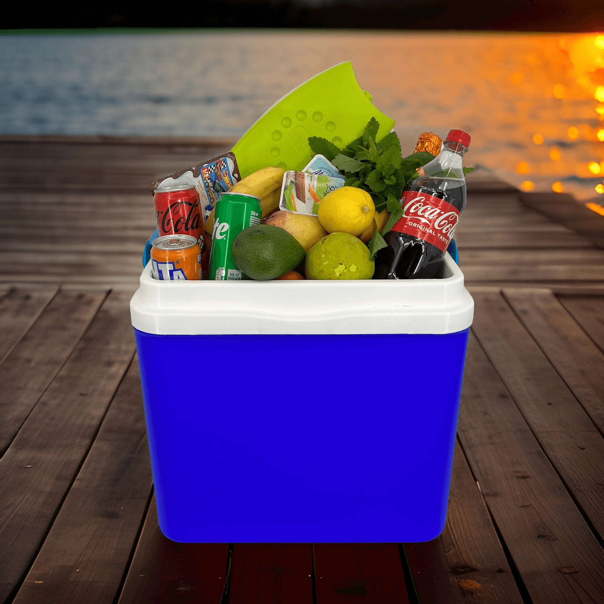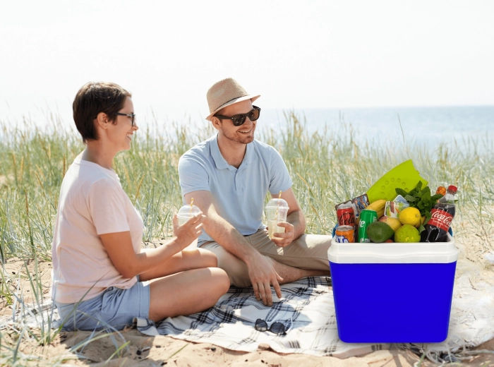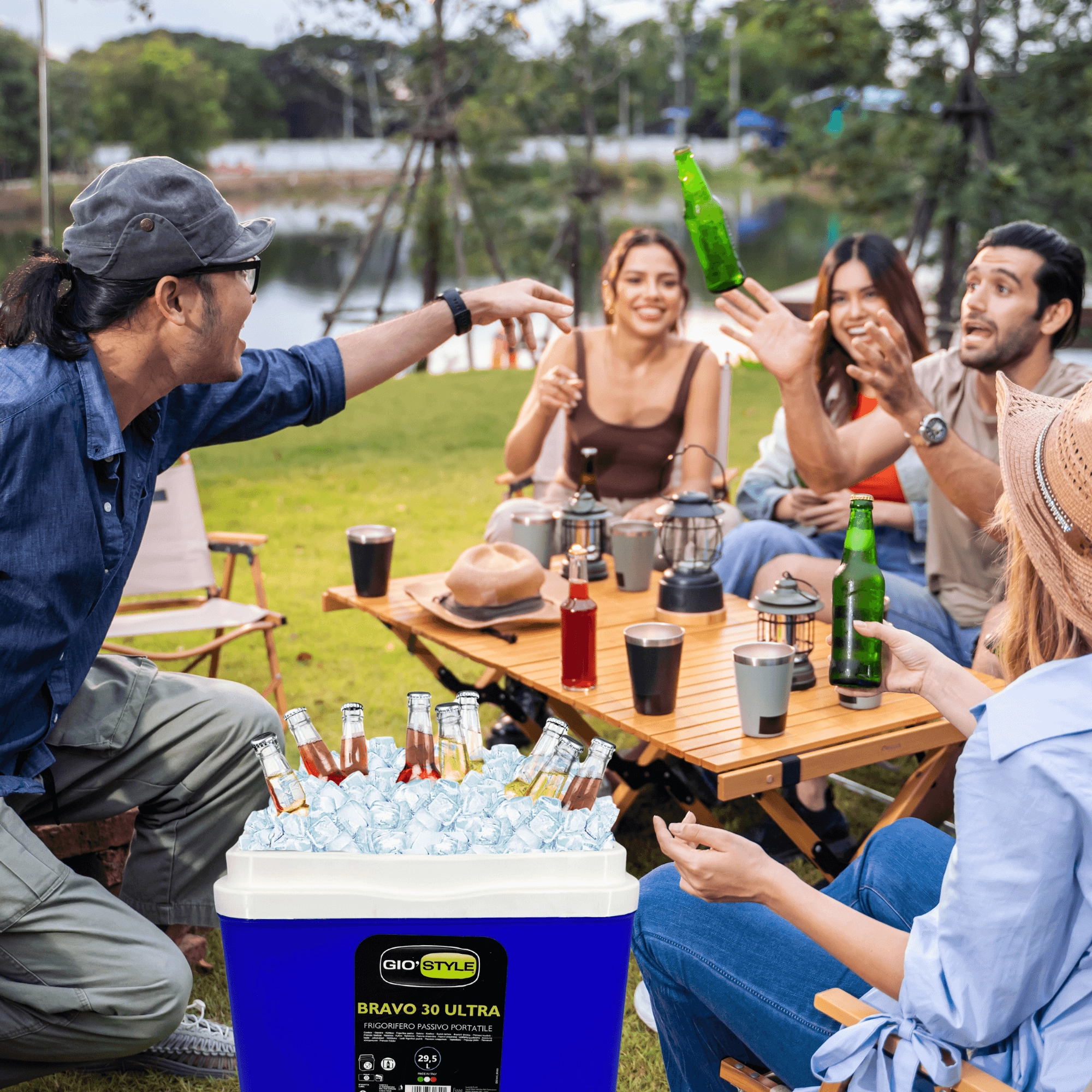 Le couvercle avec porte-gobelets intégrés améliore la stabilité ; la robuste poignée pliante facilite le transport au bord de l’eau, à la plage ou en pique-nique.
