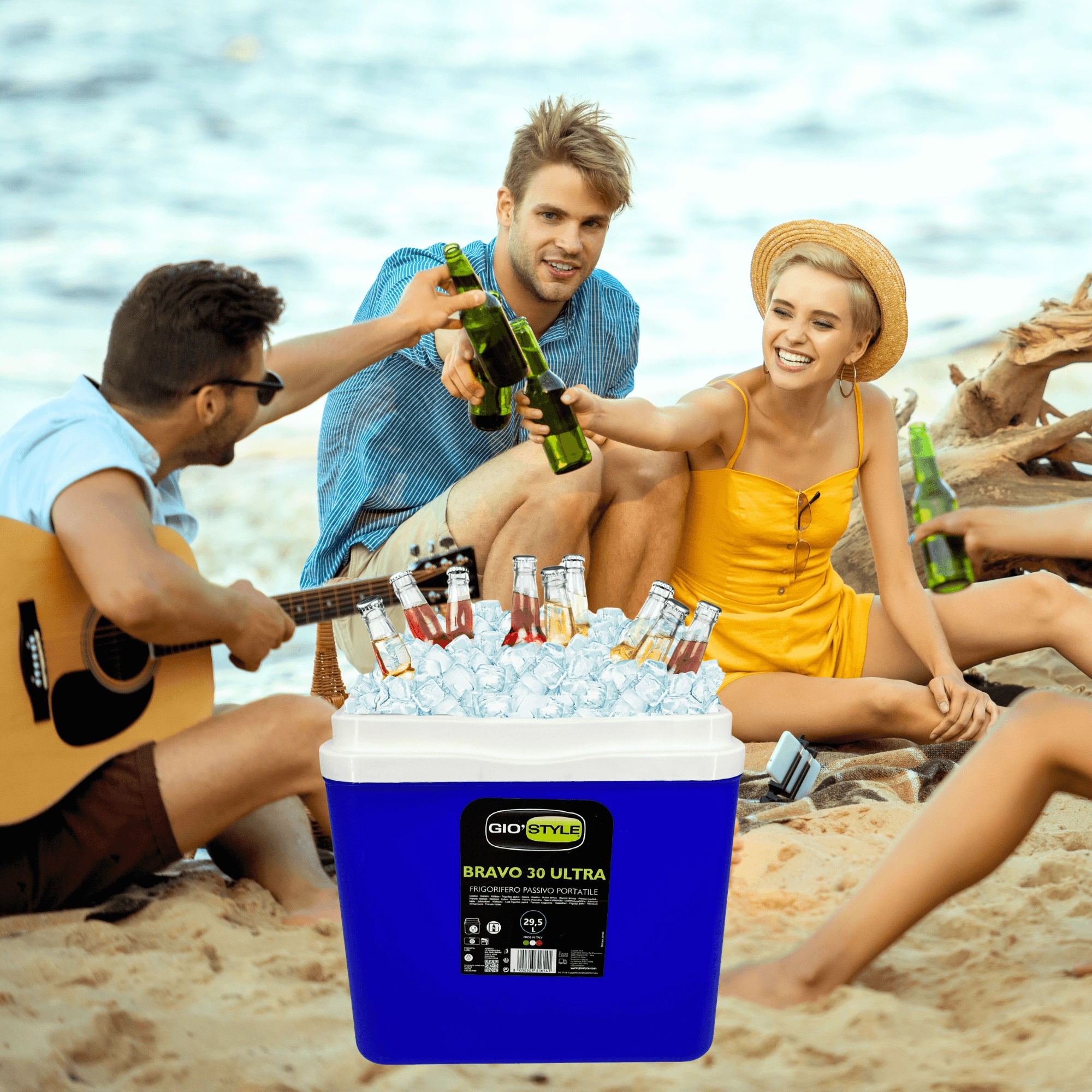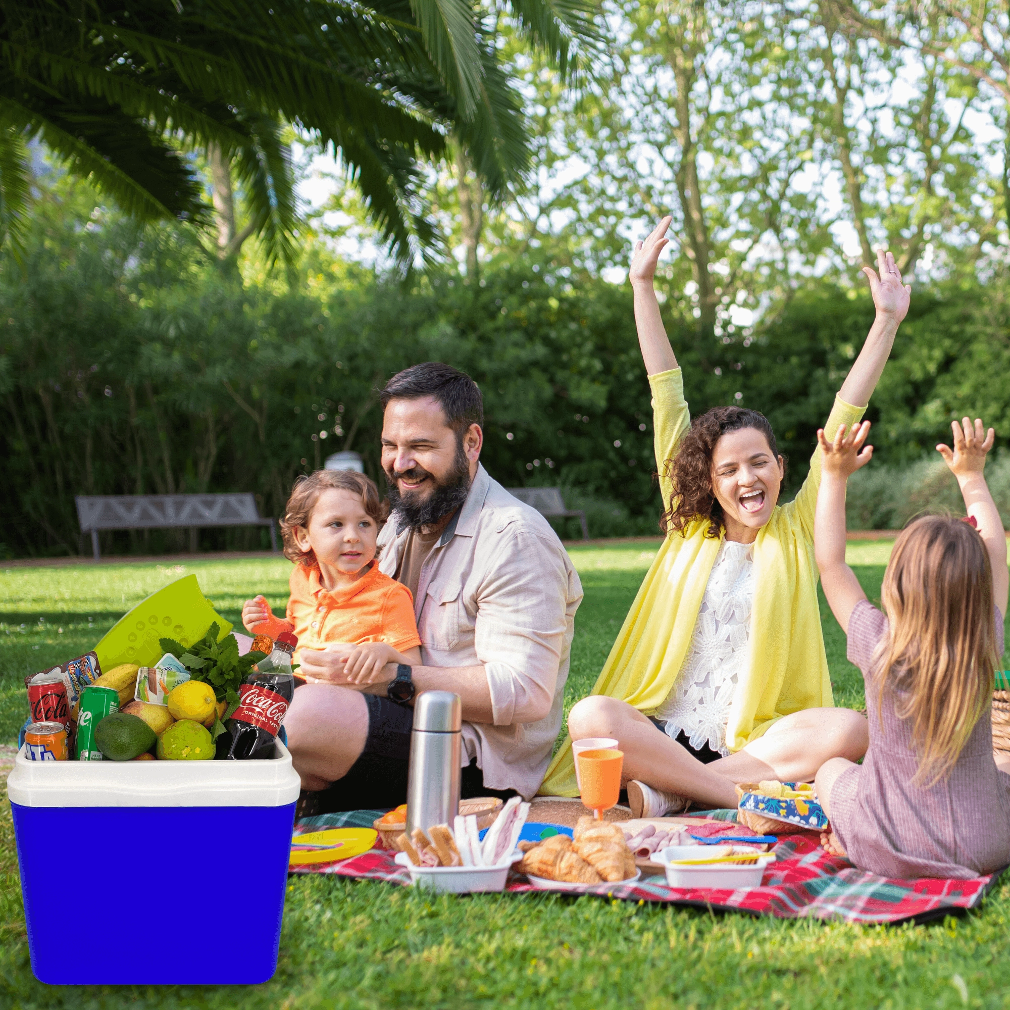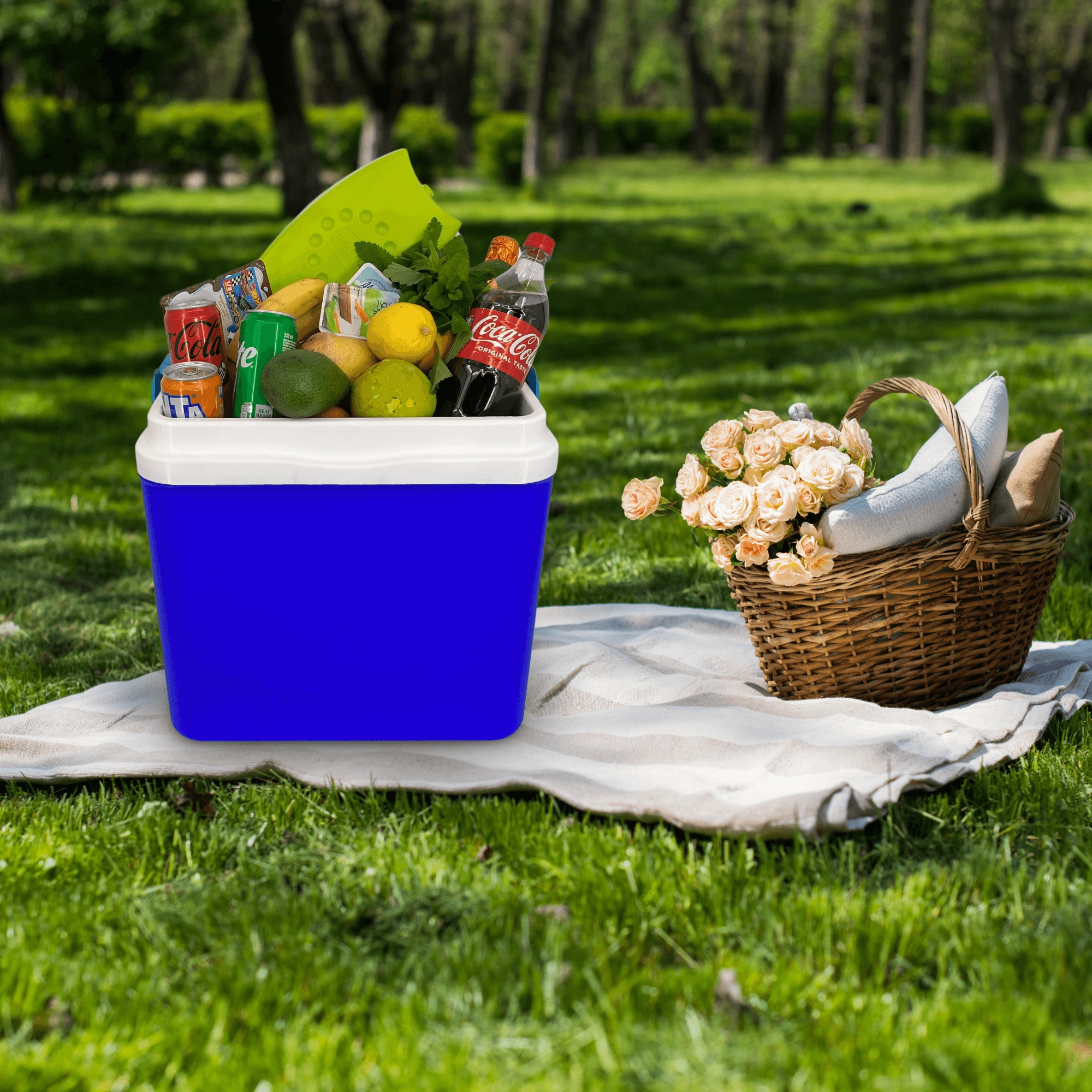 Le couvercle avec porte-gobelets intégrés améliore la stabilité ; la robuste poignée pliante facilite le transport au bord de l’eau, à la plage ou en pique-nique.
