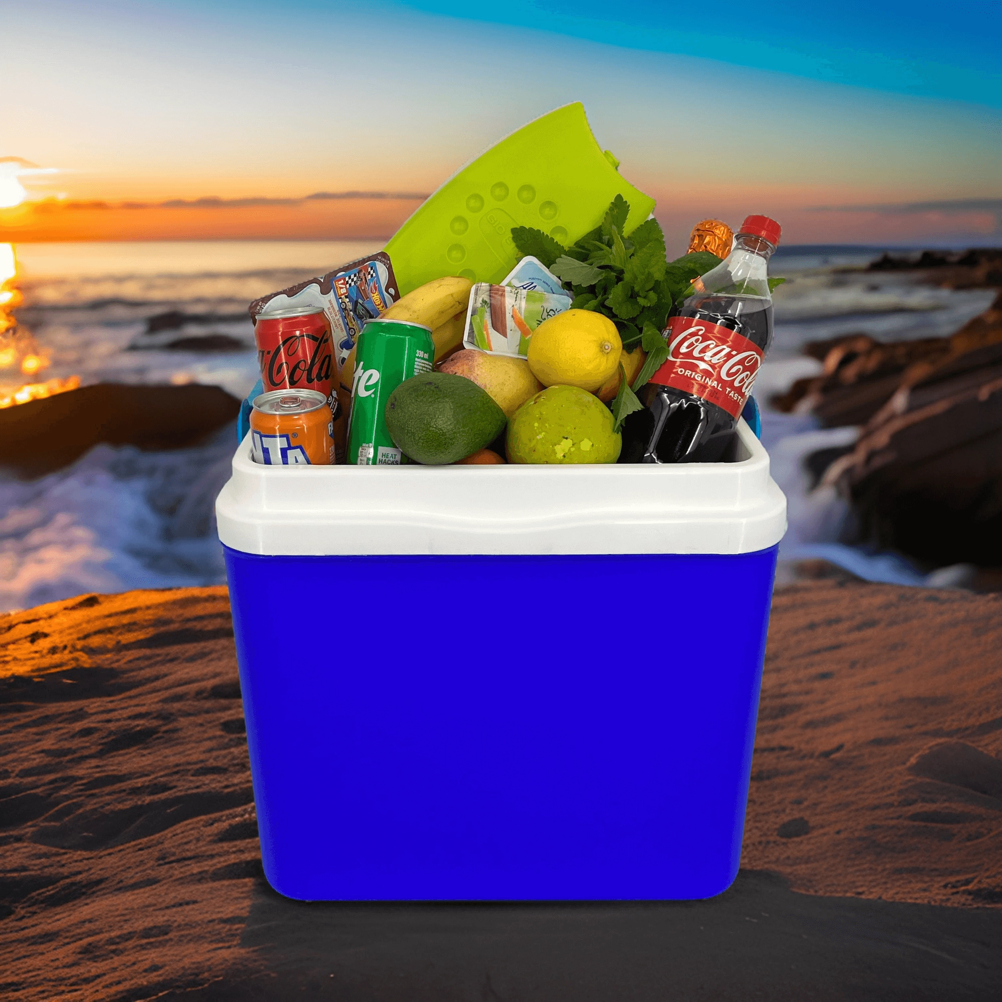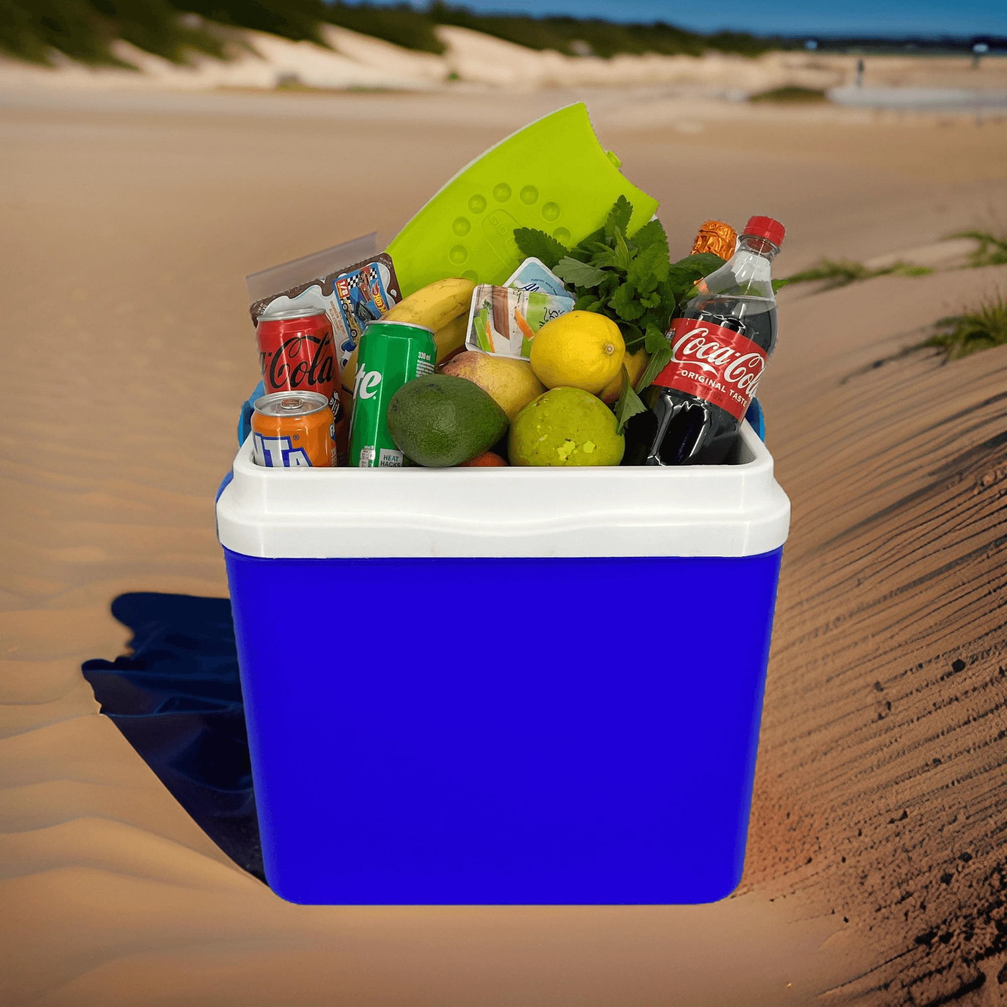La hauteur intérieure permet de placer sans problème des bouteilles de 2 l debout et ses proportions bien pensées offrent de la place pour 8× 1,5 l ou 6× 2 l côte à côte. Le couvercle dispose de porte-gobelets intégrés pour gobelets et canettes, afin que les boissons restent stables même sur terrain irrégulier.