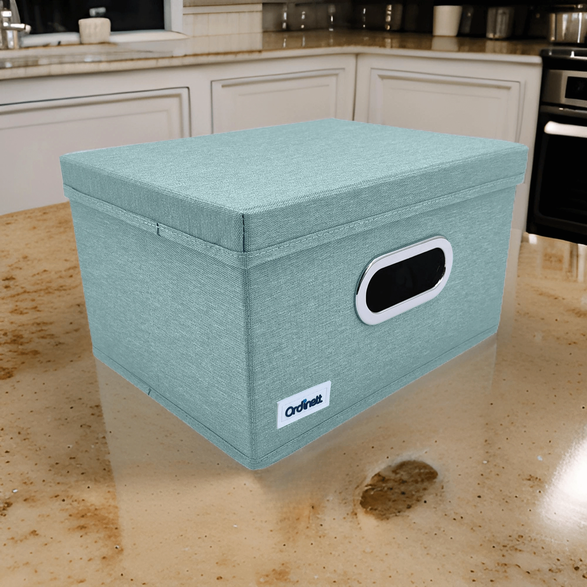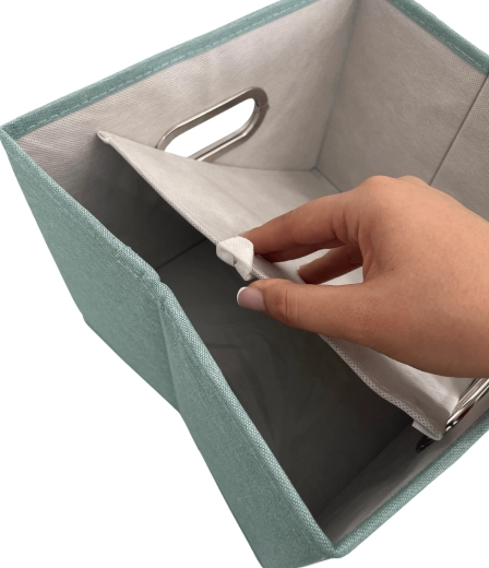 La boîte est stable grâce à son fond rigide et peut être pliée à plat quand vous n’en avez pas besoin. Les œillets à rebord métallique servent de poignées pratiques pour faire glisser la boîte hors des étagères et la transporter aisément.