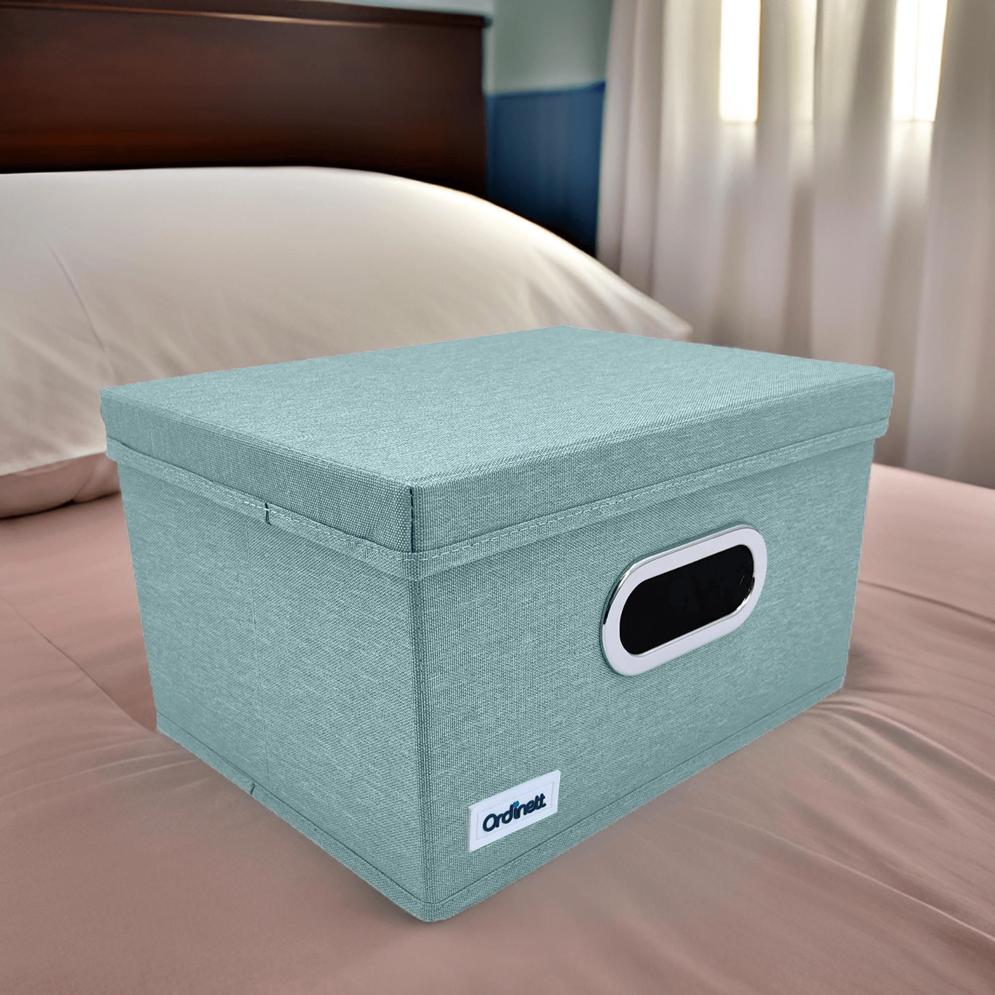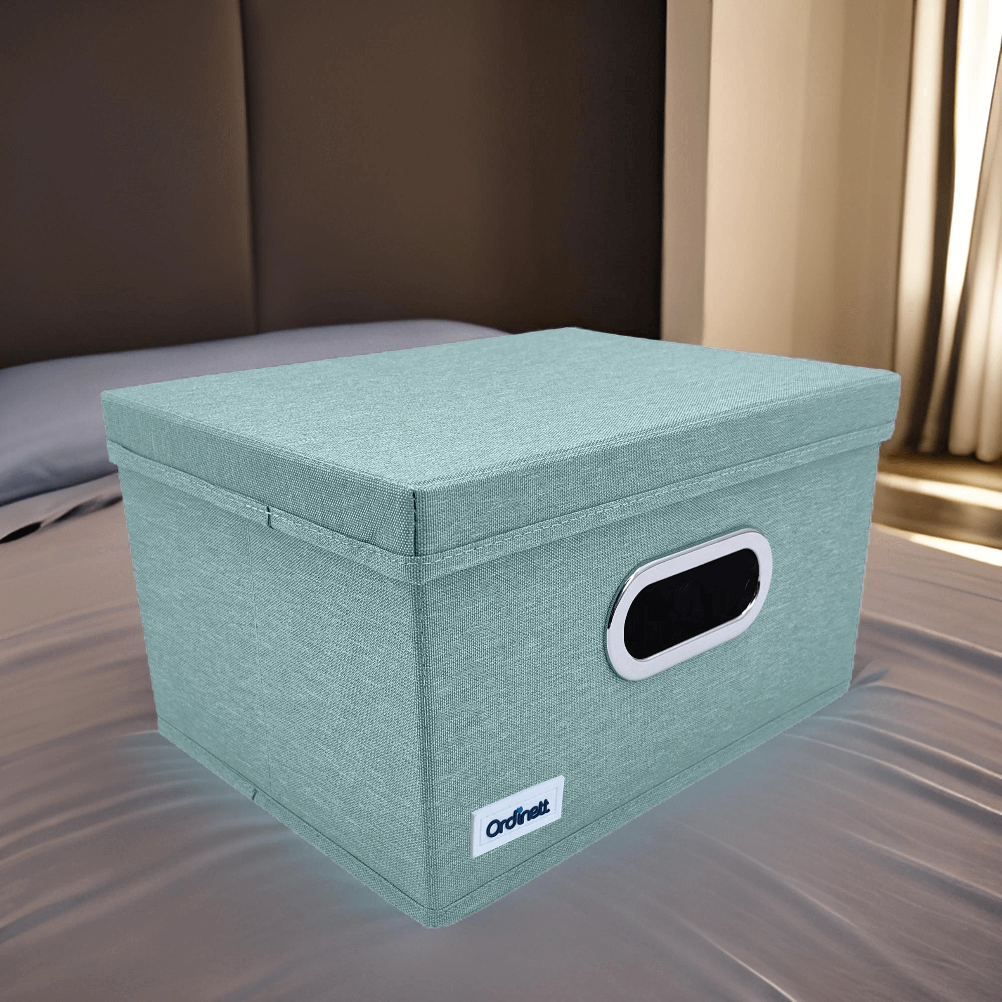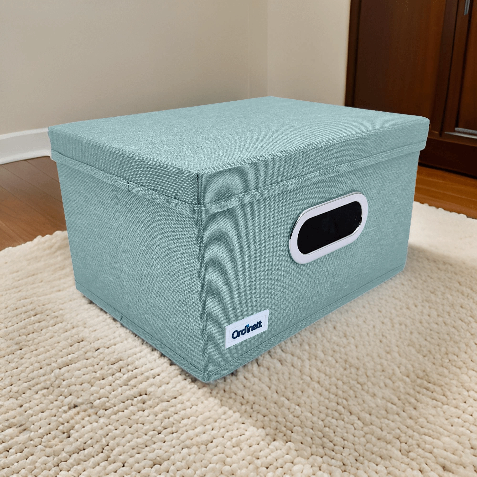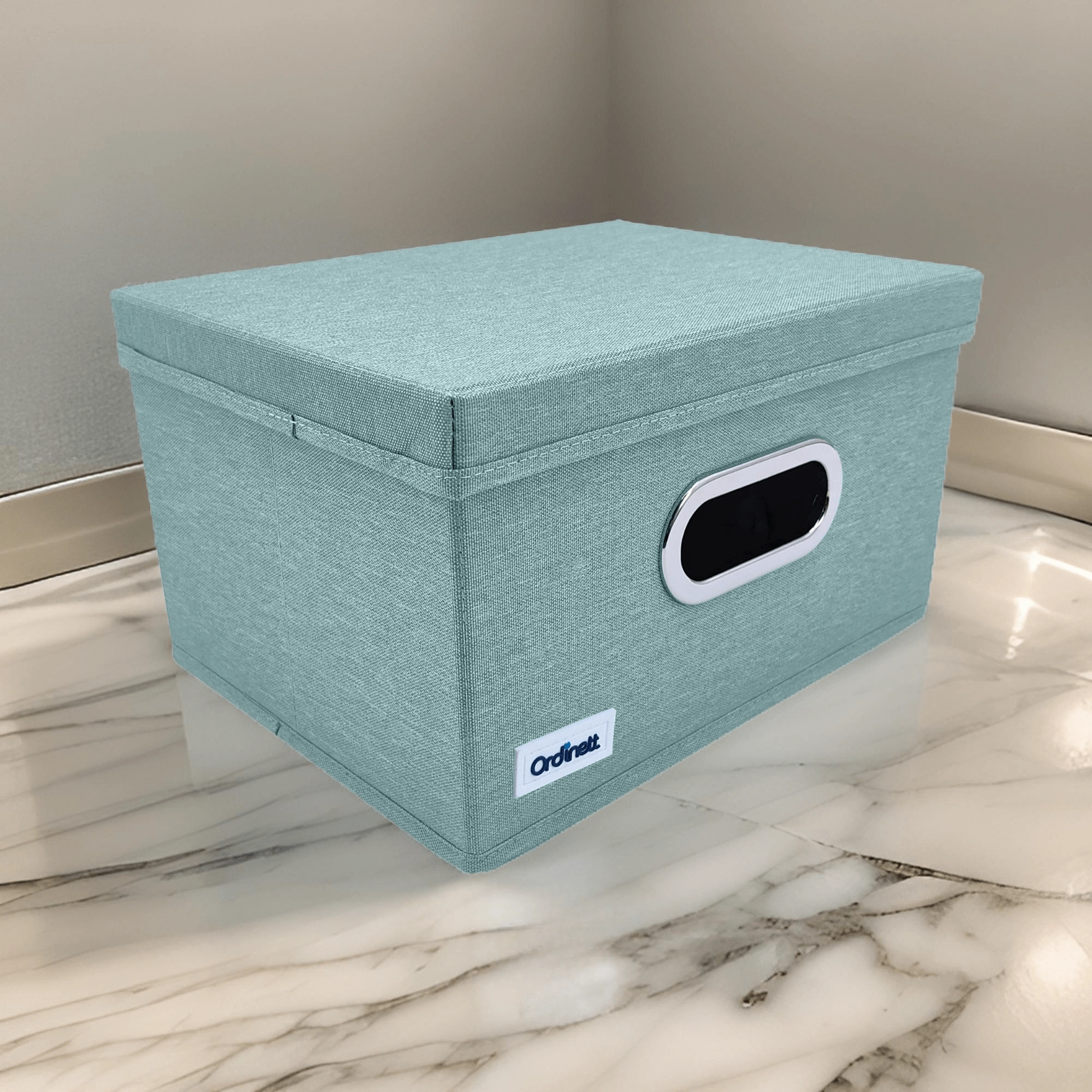 Cette boîte textile avec couvercle est idéale pour ranger de façon ordonnée le linge, les accessoires, les jouets ou les fournitures de bureau. La fenêtre ovale frontale permet de vérifier rapidement le contenu, tandis que le couvercle garde le tout propre et à l’abri. La teinte menthe élégante apporte fraîcheur et ordre à votre intérieur.