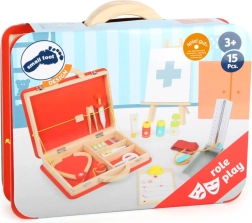 La valisette dispose de bandes élastiques et de compartiments séparés qui maintiennent tous les accessoires en place. Des illustrations avec des symboles médicaux facilitent l’orientation et rendent le jeu compréhensible même pour les plus petits. Le jeu développe la motricité fine, la communication et les capacités de narration.