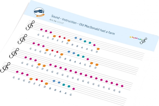 Les partitions codées par couleur incluses (par ex. « Old MacDonald ») aident les enfants à associer les couleurs aux sons et à apprendre rapidement leurs premières mélodies.