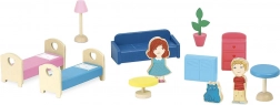 L’emballage comprend un ensemble de meubles et de figurines en bois, y compris un lit, un canapé et de petites figurines d’animaux. Les enfants peuvent ainsi créer de mini scènes domestiques.