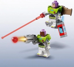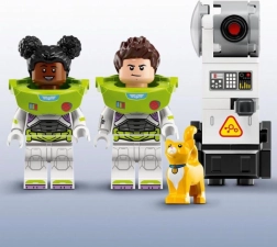 La boîte contient Buzz l’Éclair, d’autres minifigurines, un chat robot et un super équipement – laser de poignet, blaster et lanceur.
