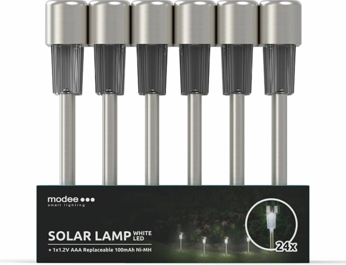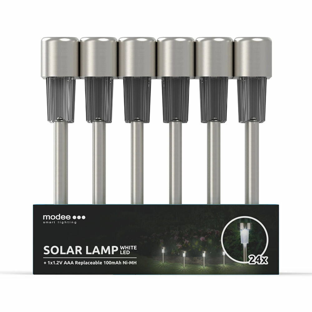 Élégante lampe de jardin solaire Modee Smart Lighting qui transforme l’énergie solaire en lumière avec un allumage automatique au crépuscule. Fabriquée en acier inoxydable de qualité et en plastique, elle offre une lumière blanc froid, est résistante aux projections d’eau (IP44) et, grâce à sa batterie rechargeable remplaçable, garantit un fonctionnement économique et sans entretien.