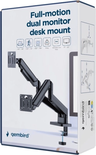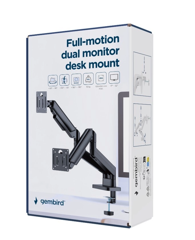 Bras de bureau double universel pour moniteurs de 17–32" avec une capacité de charge allant jusqu’à 10 kg par moniteur. Offre un réglage en hauteur fluide grâce aux vérins à gaz, rotation, inclinaison et pivot pour le mode portrait, ainsi qu’une gestion des câbles intégrée pour un poste de travail propre et ergonomique.
