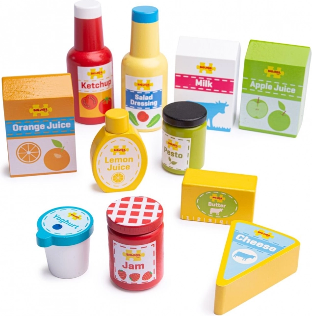Des pièces colorées et détaillées comme du ketchup, des jus, du lait, de la confiture, du beurre, du pesto, du fromage et du yaourt stimulent l’imagination et apprennent aux enfants à reconnaître les aliments.
