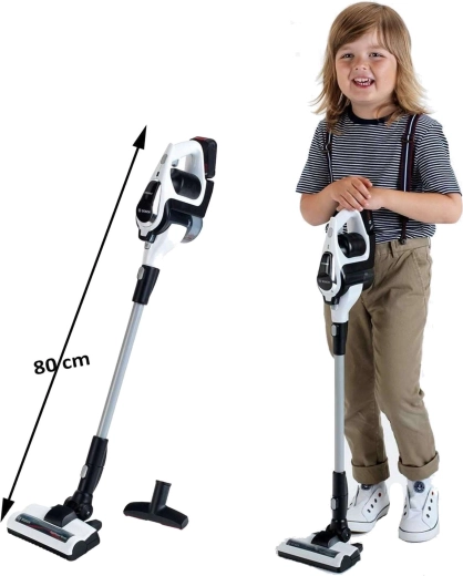 Il comprend un réservoir à saletés ouvrable pour un vidage facile, une large brosse de sol avec rouleau rotatif et un suceur étroit pour un nettoyage précis. Le manche peut être retiré facilement afin d’utiliser l’aspirateur comme une unité compacte à main – idéal pour les miettes et les nettoyages rapides pendant le jeu.
