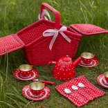 Ce charmant panier de pique-nique aux motifs à pois et petits cœurs renferme un service à thé en métal prêt pour chaque goûter imaginaire. La conception robuste avec sangles velcro réglables et bord textile garantit un transport et un rangement faciles de toutes les pièces. Les enfants développent leur interaction sociale, leur motricité et leur créativité.