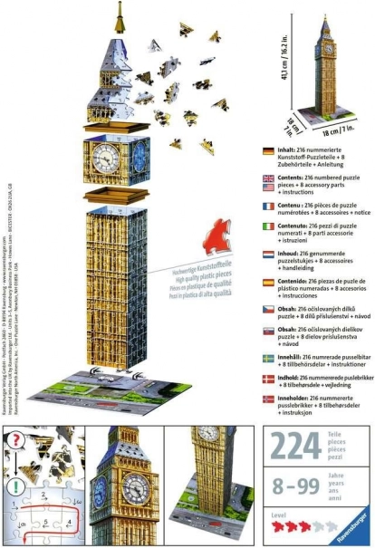 Le kit comprend un total de 216 pièces de puzzle numérotées, 8 pièces d'accessoires et un guide détaillé. Une fois le puzzle complété, il mesure environ 18 x 18 x 41 cm. Ce modèle est idéal tant pour les fans de l'entreprise Ravensburger que pour ceux qui aiment l'architecture et Londres.