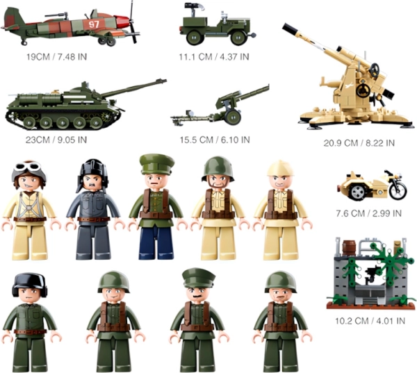 Construisez un char, un véhicule tout-terrain, un avion, une moto et des pièces d’artillerie. Des détails réalistes et des parties mobiles permettent de créer des scénarios de combat palpitants.