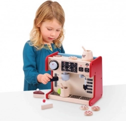 Avec cette machine à café, les enfants peuvent expérimenter le rôle de barista. Le set inclut une machine à café avec un bras amovible et un distributeur de lait mobile. Le tout est complété par un écran de commande avec un bouton rotatif cranté et des boutons peints.