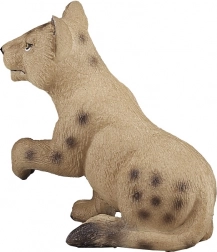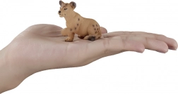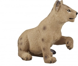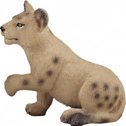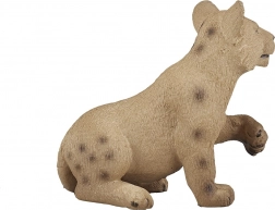 La figurine capture le lionceau dans une pose naturelle, avec une texture de pelage fine et des taches authentiques typiques des jeunes.