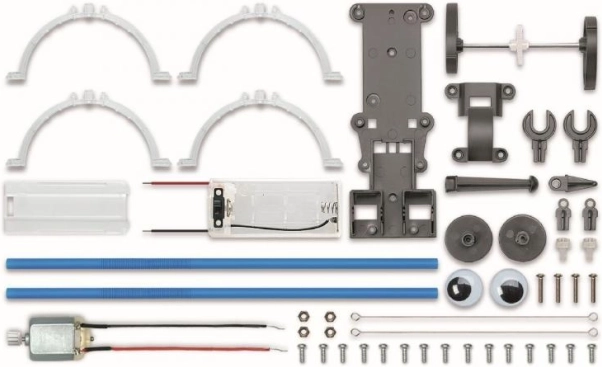 Moteur et support, engrenages, cadre/châssis, roues et pièces du train roulant, vis et écrous, bras flexibles, yeux, notice illustrée