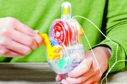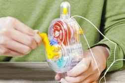 Le mécanisme est entièrement visible : les roues dentées colorées et la dynamo illustrent clairement la transformation de l’énergie en lumière.