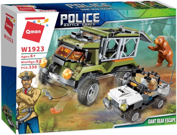 Qman Police Battle Force – l’évasion de l’ours géant est un set haletant qui apportera aux enfants une bonne dose d’action créative. Partez en terrain difficile avec le camion tout-terrain, découvrez la cache des braconniers et mettez en scène un sauvetage dramatique grâce à l’équipement du véhicule. Avec des fonctions bien pensées comme la suspension, le treuil et le lanceur, chaque mission est différente et pleine de surprises.