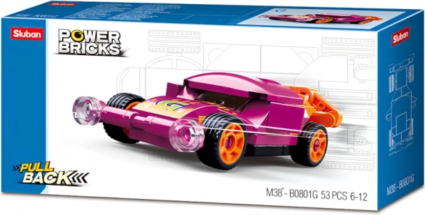 Voiture à remontoir violette Sluban Power Bricks avec 53 pièces. Compatible avec LEGO, COBI et Mega Bloks, plastique ABS résistant, faible difficulté, pour enfants dès 6 ans.
