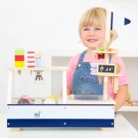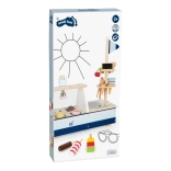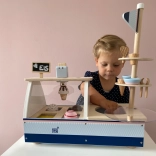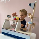 Le set inclut également un bol avec cuillères, des gaufrettes et divers accessoires. L’ensemble est conçu dans un style doux et neutre en termes de genre, ce qui le rend parfait pour chaque enfant. Dimensions du stand : 45×21×47 cm, hauteur du plan de travail : 11 cm.