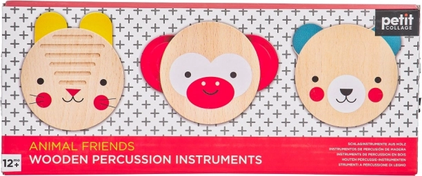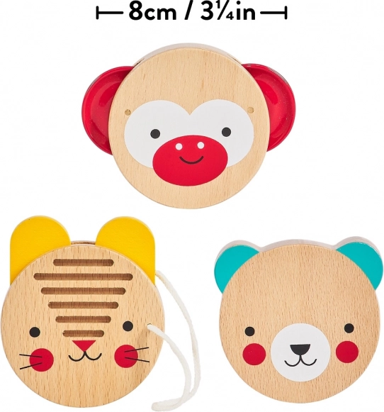 Trois instruments de percussion simples aux motifs d’animaux encouragent la perception naturelle du rythme et le plaisir de jouer de la musique dès le plus jeune âge.