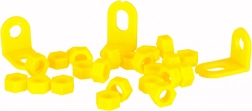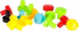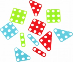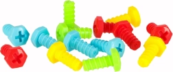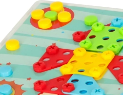 Un grand ensemble de vis colorées, de plaquettes et de pièces de formes variées stimule la créativité et encourage la réalisation autonome de mosaïques et de modèles.