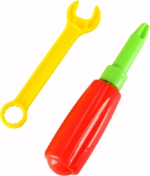 Les enfants peuvent visser comme de vrais bricoleurs grâce à une perceuse à piles sûre, un tournevis et une clé – idéal pour entraîner la motricité.