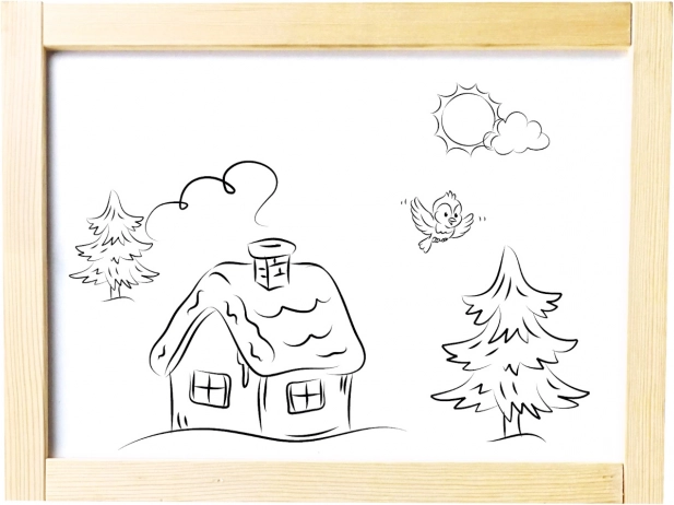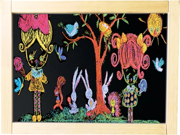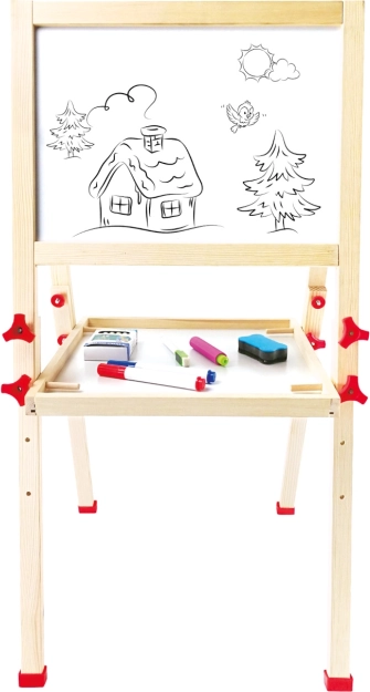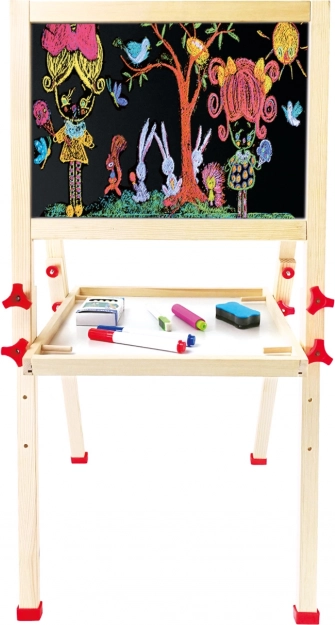 Tout le nécessaire est inclus: craie, feutre, éponge et plusieurs images magnétiques. Le tableau se plie rapidement et se range de façon compacte, occupant ainsi peu de place. Les deux surfaces de travail permettent à deux enfants de créer en même temps.
