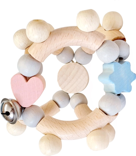 Le hochet moteur en bois de la marque Hess séduit par ses couleurs pastel et sa petite clochette, qui stimulent l’imagination et améliorent la motricité fine de l’enfant.