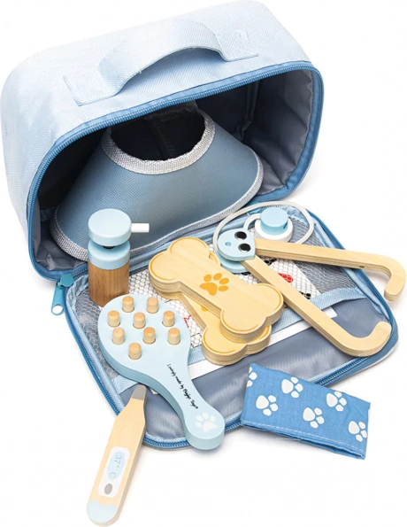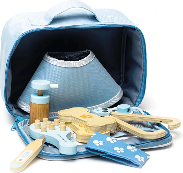 trousse textile, stéthoscope, thermomètre, otoscope, seringue, bandage, brosse, collerette de protection, os en bois et autres accessoires