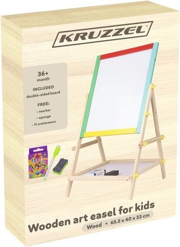 Tableau double face en bois pour enfants avec une face noire à craie et une face blanche effaçable à sec, qui stimule la créativité, l’apprentissage et la motricité fine. Le cadre coloré est en bois finement travaillé, et la structure stable est complétée par une étagère pratique pour les accessoires. Le coffret comprend un marqueur, une éponge et des craies – prêt à l’emploi immédiatement.