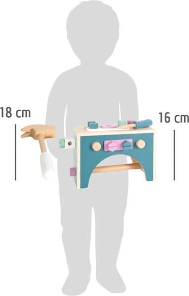 Pratique coffret à outils en bois 2-en-1 offrant aux enfants d’innombrables possibilités de jeu grâce à sa polyvalence. En le retournant, ils peuvent aussi l’utiliser comme plan de travail, et tous les outils se rangent facilement grâce aux ouvertures latérales.