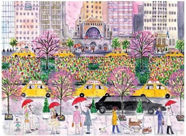 Une illustration captivante de Park Avenue au printemps, avec ses taxis jaunes iconiques et ses arbres en fleurs, apporte une atmosphère new-yorkaise à votre assemblage.
