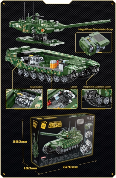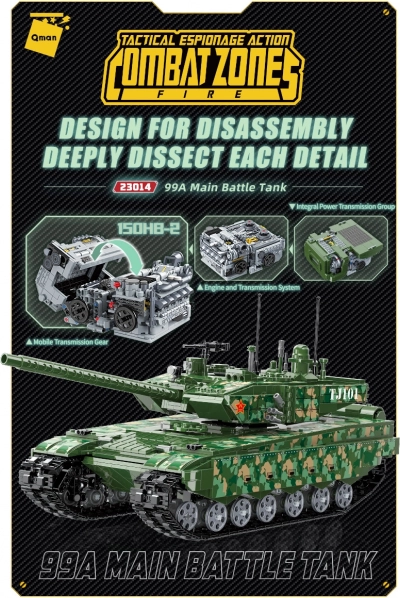 Construisez l’emblématique char chinois 99A avec 2 743 pièces et découvrez ses secrets grâce à un intérieur facilement accessible, une tourelle entièrement rotative et un châssis à suspension indépendante. L’élément unique est le grand modèle de l’unité motrice 150HB-2, qui permet d’examiner les détails de la conception. Le set Qman est compatible avec d’autres marques et fabriqué en plastique ABS résistant.