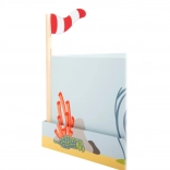 Le jouet est livré dans une boîte illustrée en couleur qui sert également de plateau de jeu, facilitant le rangement et le transport.