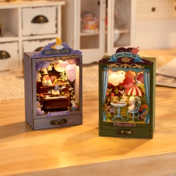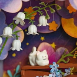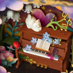 Ce diorama miniature enchanteur vous permet de plonger dans un monde de fantaisie. À l'intérieur du meuble, un éclairage chaleureux crée une profondeur magique de la scène. Un compartiment pratique dans la partie inférieure du meuble permet de ranger de petits objets. L'assemblage inclut le travail avec des pièces en contreplaqué et en carton, faciles à préparer. Les composants électriques sont déjà préassemblés, ce qui facilite l'installation. Seules des ciseaux sont nécessaires, car les autres outils sont inclus dans l'emballage.