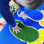 L'ensemble comprend plusieurs types de surfaces, comme le feutre, la mousse de silicone, le gazon artificiel et d'autres, qui aident à développer le toucher et la motricité fine.