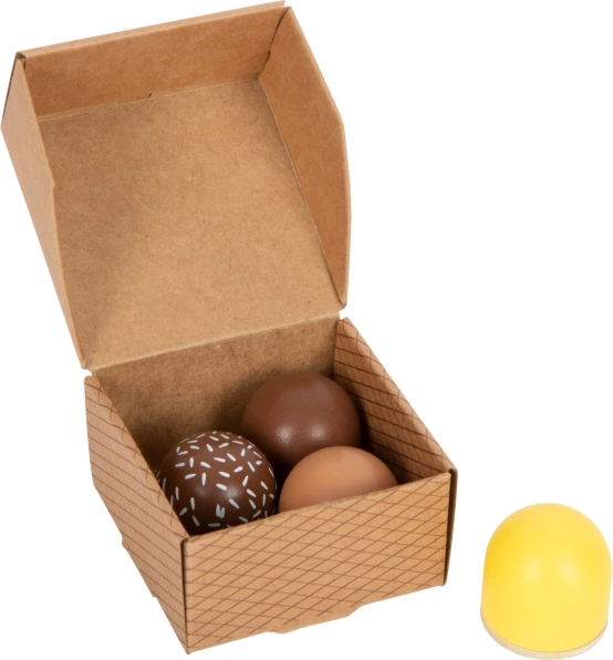 Quatre variantes de pralines - chocolat blanc, chocolat noir, chocolat noir avec paillettes et chocolat au lait - rafraîchissent agréablement les jeux d'enfants. Leur apparence naturelle et leur emballage en carton éco sont conçus pour ravir et inspirer les enfants à un jeu imaginatif.