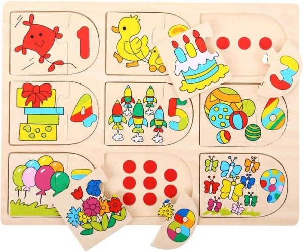 Vos petits curieux vont à coup sûr adorer ce petit puzzle intéressant et malin. Non seulement ils s’amuseront à trier les pièces aux bons endroits, mais ils pourront aussi insérer uniquement les images puis leur associer les bons chiffres. Chaque pièce du puzzle en bois est dimensionnée pour faciliter le soulèvement et la prise en main par de petites mains d’enfant. Les puzzles sont imprimés avec des images ou des couleurs qui favorisent l’apprentissage et ajoutent une valeur éducative. Une excellente façon de développer la dextérité, la reconnaissance des formes, la concentration et le comptage dès le plus jeune âge. Principales caractéristiques : fabriqué à partir de matériaux de haute qualité issus de sources responsables, conforme aux normes européennes de sécurité en vigueur.