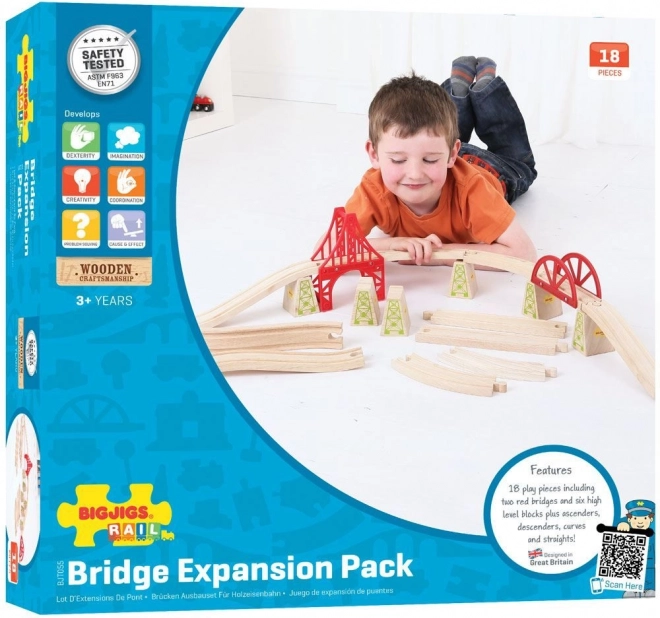 Étendez votre circuit de train en bois avec un set de pont universel de 18 pièces qui ajoute de la hauteur et de l’aventure au jeu. L’ensemble comprend des rails en montée et en descente, des supports et des éléments de pont pour franchir facilement les obstacles. Il est entièrement compatible avec la plupart des circuits de train en bois et fabriqué en bois de qualité. Compatibilité, matériaux de qualité, jeu sûr et développement de l’imagination et de la motricité fine.