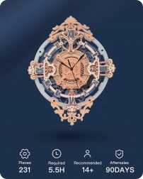 Difficulté moyenne, 231 pièces et notice claire. Le montage prend environ 5 heures et aboutit à une horloge décorative avec possibilité d’alignement précis du cadran au mur.