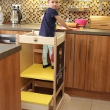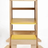 La structure en bois stable et la rambarde autour de la plateforme permettent aux enfants d’atteindre en toute sécurité le plan de travail et de participer aux activités quotidiennes.