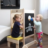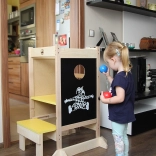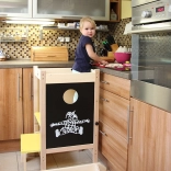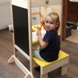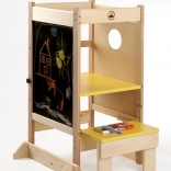 Grâce à son design bien pensé, la tour se transforme facilement en petit bureau avec chaise, ainsi qu’en tableau à craie. Deux positions de hauteur de la plateforme s’adaptent à la croissance de l’enfant et offrent une utilisation confortable et sûre.