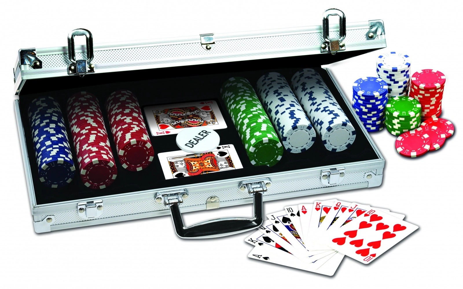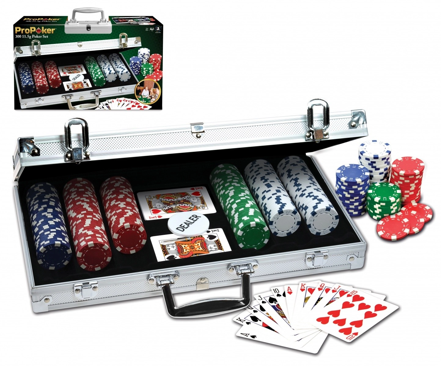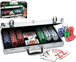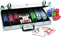 Set de poker complet dans une élégante mallette en aluminium pour tournois à la maison et moments de détente entre amis. Contient 300 jetons de qualité d’un poids de 11,5 g en 4 couleurs avec des symboles de dés, idéal pour une expérience de jeu authentique.
