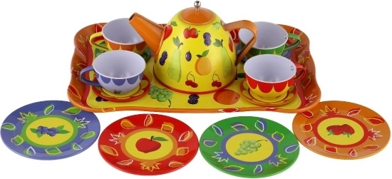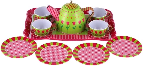 La boîte contient tout le nécessaire pour un petit goûter-thé – une théière, des tasses avec soucoupes et des assiettes. Le set est idéal pour développer les compétences sociales, apprendre les règles de table et jouer ensemble avec les amis. La vaisselle n’est pas destinée à la préparation réelle ni à la consommation de boissons.